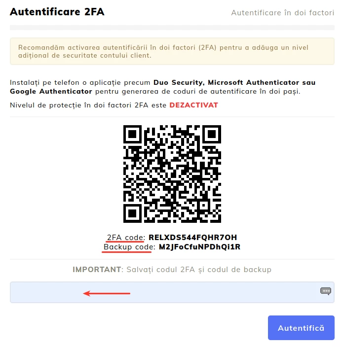 2FA code - represents the unique code that we will enter into the mobile application to establish the connection between the application and the client account;