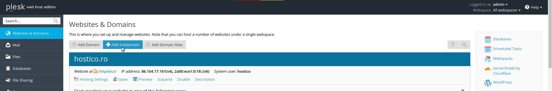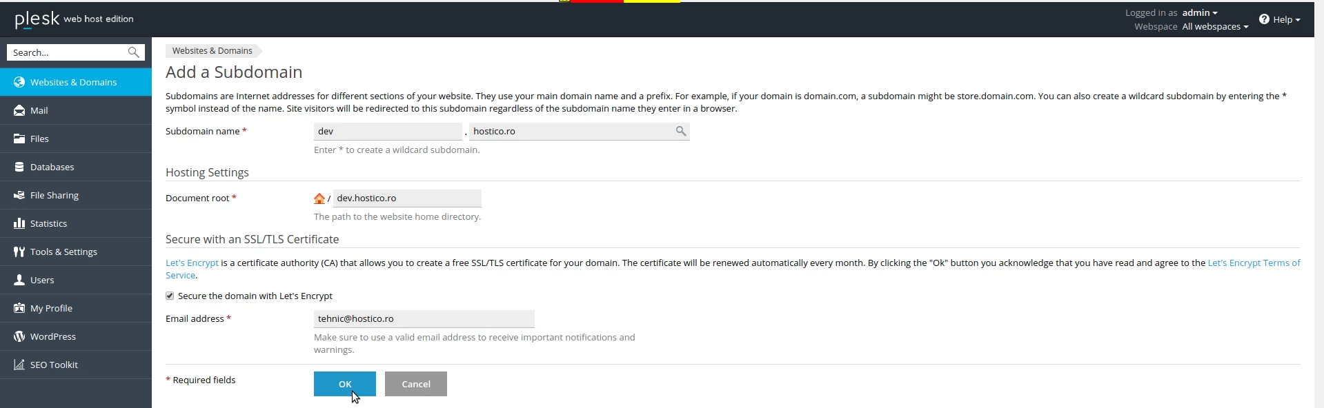 Adding a subdomain in the Plesk administration panel.