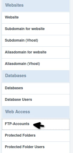 • After logging in to the panel, we will click on the Sites button in the navigation bar, and then we will click on FTP-Accounts in the Web Access category