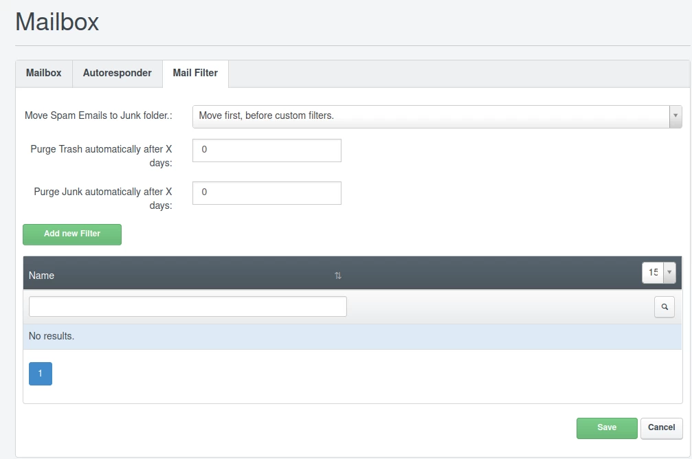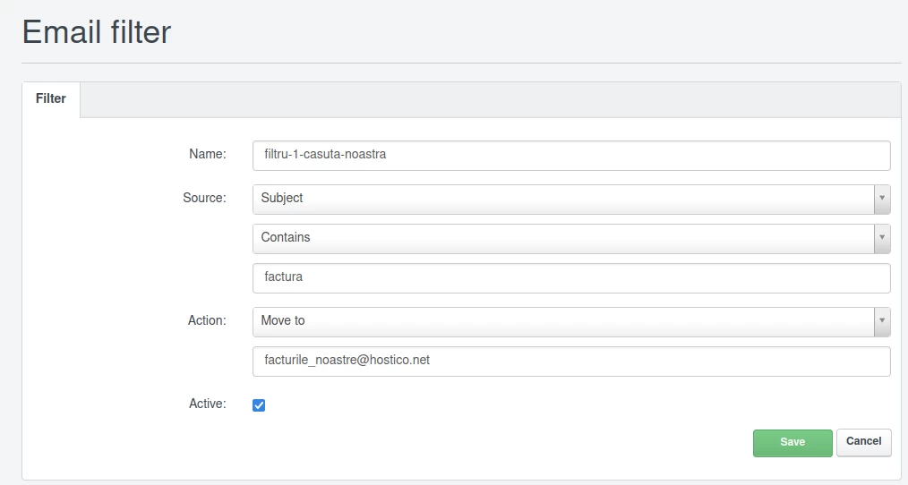 In the Mail filter tab, we can set customizable additional filters for the email messages sent to the mailbox, which will run automatically before they enter the Inbox, performing various configurable actions from the Add new Filter button.