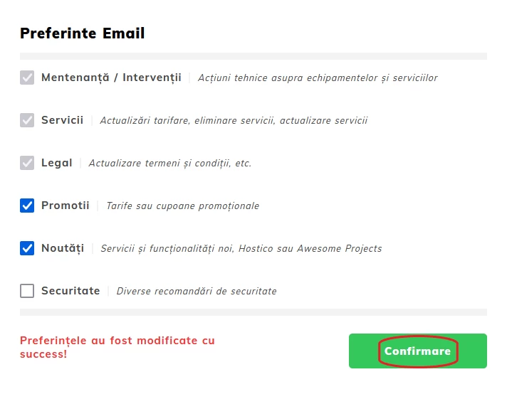 Update your email preferences in your Hostico account to receive personalized notifications about maintenance, services, promotions, and security.