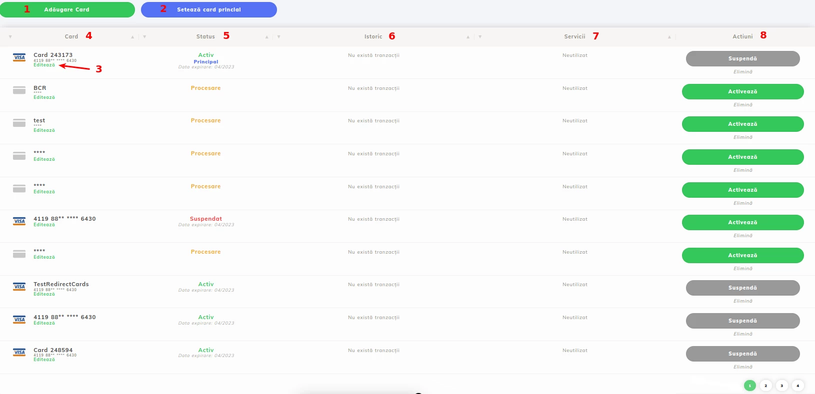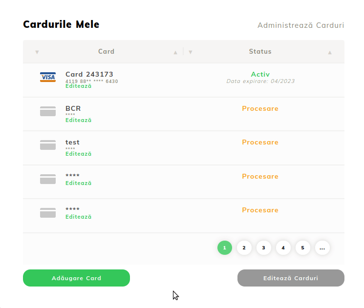 - We keep the window open (User -> User link), and we redirect our attention again to the section My Cards. You will notice that the previously added card is present in the table and has an active status. This means that the bank has successfully validated the addition request and the card can be used for making payments.