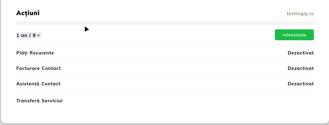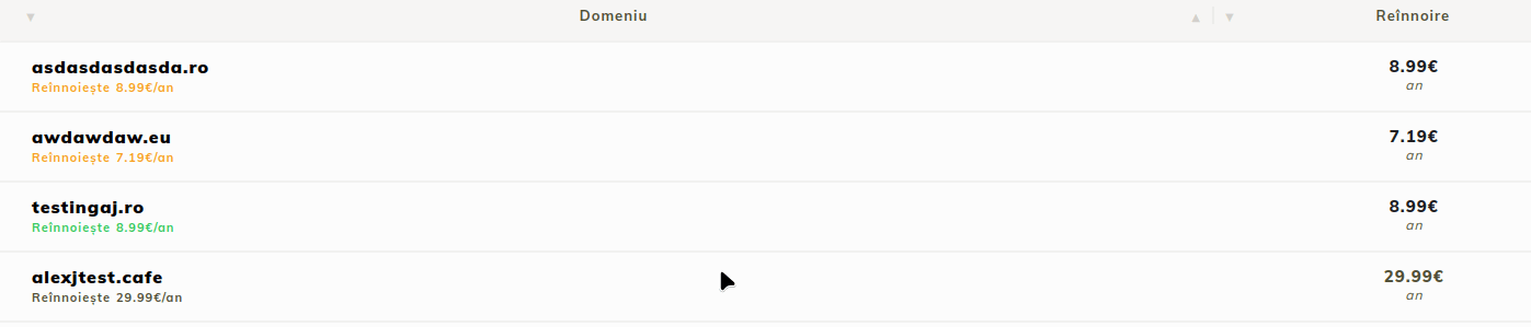 - Your domains registered with Hostico are displayed. You can see the name, status, remaining active period, and renewal cost.