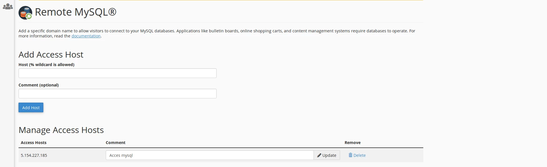 - On the next page, we will add the IP address from which the connection to MySQL will be made, the comment or description is optional, and then click on Add Host to complete the operation.