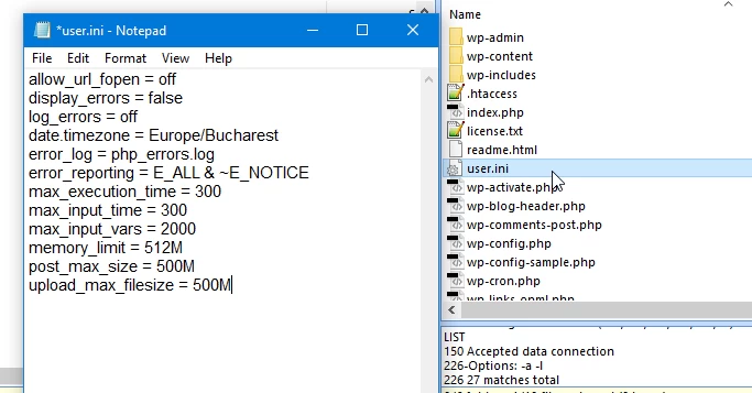 Next, to modify the PHP directives, we will create a file named ".user.ini" (locally on the computer), in which we will set the desired directives. After saving the file, we will upload it to the directory mentioned above using the FTP client;